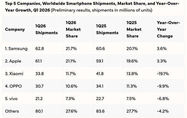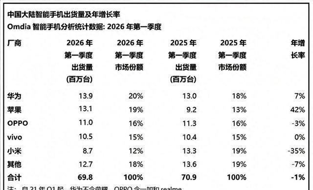 2026年第一季度的数据出来后,很多人的第一反应不是意外,是沉默,国内手机市场约6900万到6980万台,小米只拿到870万台,环比和同比的压力一起压下来,社交平台上那句“天塌了”传得很快