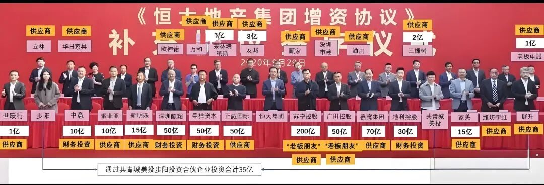 其他重要战略投资者还包括中信聚恒(投资50亿元,后改名信恒聚)、嘉寓投资(累计投资70亿元)、广田控股、安信信托等多家企业。在2020年9月29日的补充协议签字仪式上,外界得以窥见许家印在内地的强大朋友圈——仪式上密密麻麻坐着两大排各企业的代表,包括苏宁控股董事长张近东、正威国际董事局主席王文银、广田控股董事长叶远西、安信信托董事长邵明安、嘉寓集团董事长田家玉等,其中坐在许家印左右手的就是张近东和王文银。