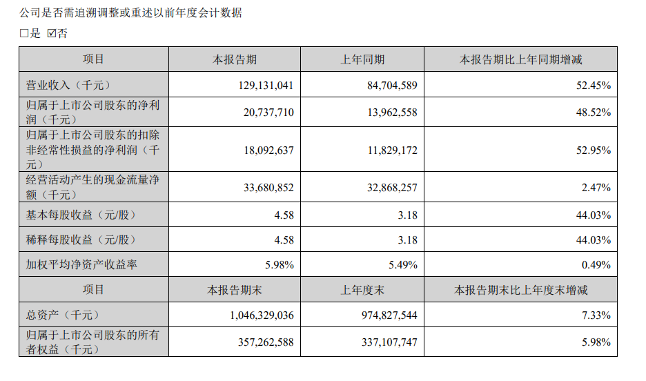 支撑这一切雄心的,是实打实的业绩。根据其2026年一季报显示,宁德时代单季度实现营业收入1291.31亿元,同比大增52.45%,创下历史新高;归属于上市公司股东的净利润达到207.38亿元,同比增长48.52%,日赚约2.3亿。一季度动力与储能电池合计销量突破200GWh,其中储能部分占比约25%,对应约50GWh。这也说明了其储能业务正在快速摆脱“配角”身份,成为宁德时代业绩第二条强劲的增长曲线。