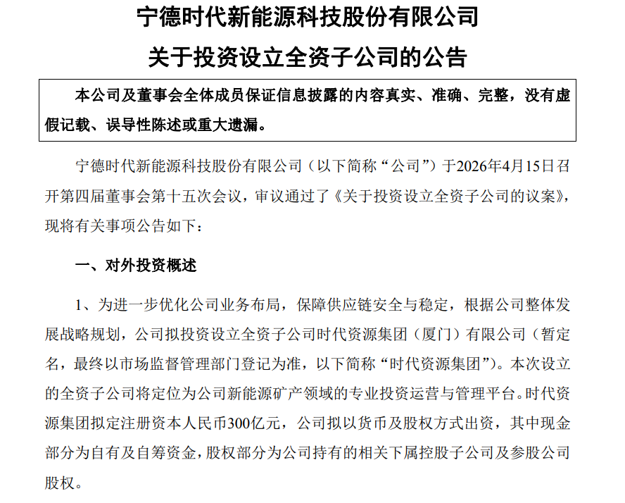 紧随市值再创新高之后,4月15日晚间,宁德时代公告拟成立全资子公司“时代资源集团”,注册资本高达300亿元。这家新公司将作为新能源矿产领域的专业投资与管理平台,整合公司已有的海内外矿业资产。