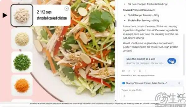 未来在任意食谱页面,用户即可一键调用技能快速计算热量,并分析糖分、蛋白质、脂肪的摄入量是否超标。值得一提的是,为方便用户上手,谷歌还将推出技能库(Skills library),提供生产力、购物、食谱、预算等领域的常用任务和工作流模板。