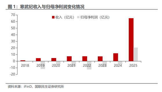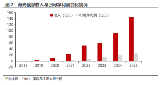 国产算力龙头业绩保持快速增长态势。1)寒武纪:收入从2018年的1.17亿元增长至2025年的64.97亿元,归母净利润则对应从亏损转为盈利,2025年实现归母净利润20.59亿元。2)海光信息:收入利润同样实现双高增,2025年收入、归母净利润分别达到143.77亿元、25.45亿元,同比增速分别达到57%、32%。