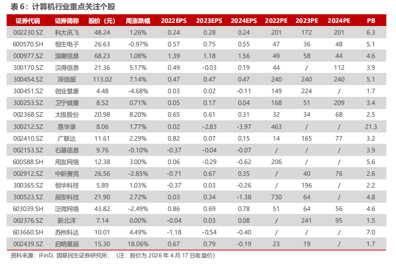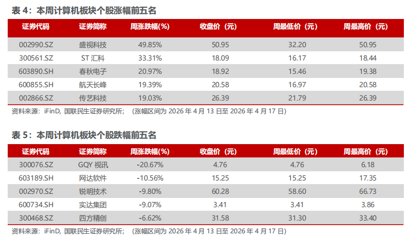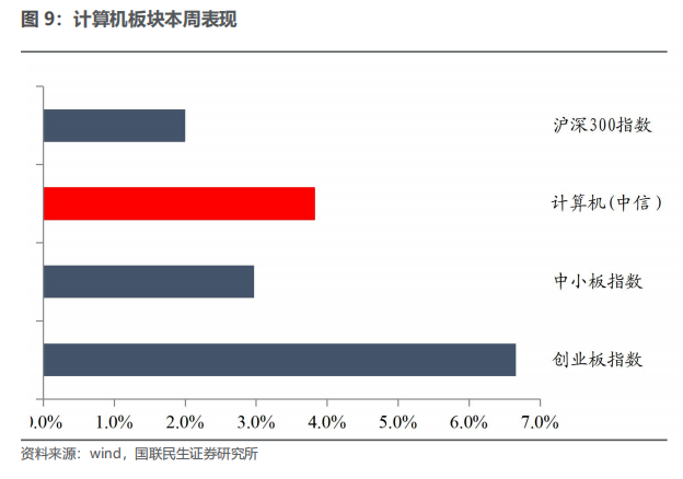 本周(04.13-04.17)沪深300指数上涨1.99%,中小板指数上涨2.96%,创业板指数上涨6.65%,计算机(中信)板块上涨3.82%。板块个股涨幅前五名分别为:盛视科技、ST汇科、春秋电子、航天长峰、传艺科技;跌幅前五名分别为:GQY视讯、网达软件、锐明技术、实达集团、四方精创。