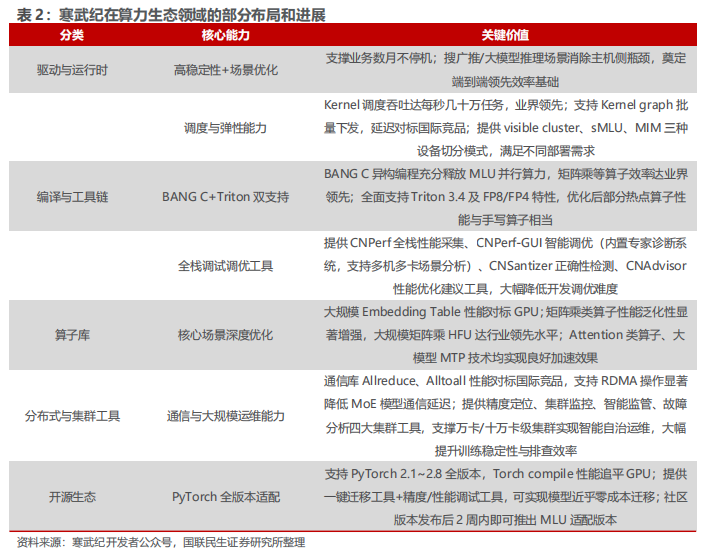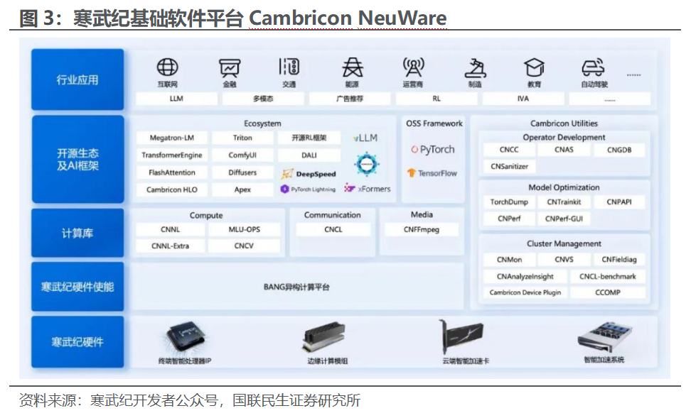 同时,生态的优化也成为国产算力发展的关键。以寒武纪为例,经过多年投入与技术积累,寒武纪Cambricon NeuWare基础软件平台已日趋成熟:不仅全面兼容社区最新版本PyTorch和Triton算子开发语言,支持用户模型与自定义算子快速迁移;且经过持续全栈优化,平台多项指标均已达到业界领先水平。尤其针对当前行业内极具挑战的大规模集群运维实践需求,平台进一步完善了多项集群工具,为集群环境下大规模训练、推理业务的部署、运维、调试及调优提供了坚实底座。
