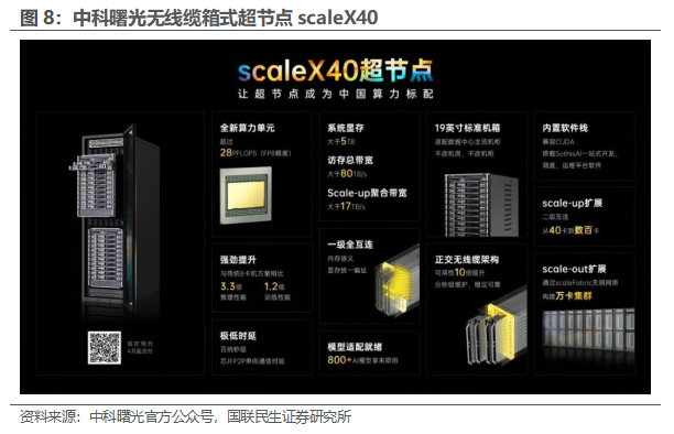 中科曙光:全场景覆盖产品矩阵,开放生态助力国产算力前行。中科曙光推出世界首个无线缆箱式超节点scaleX40。scaleX40采用正交无线缆一级互连架构,实现计算节点与交换节点直接对插,从根源上消除线缆带来的性能损耗与运维风险。scaleX40单节点集成40张GPU,总算力超过28PFLOPS (FP8精度),HBM总显存超过5TB,访存总带宽超过80TB/s,形成高密度算力单元,满足万亿参数大模型的训练与推理需求。部署层面,产品采用标准19英寸箱式设计,实现算力单元与机柜解耦,部署周期从数月级大幅缩短至数小时,交付效率显著提升;系统可靠性达99.99%,高密场景信号损耗与整体能耗同步优化,长期运维成本有效下降。