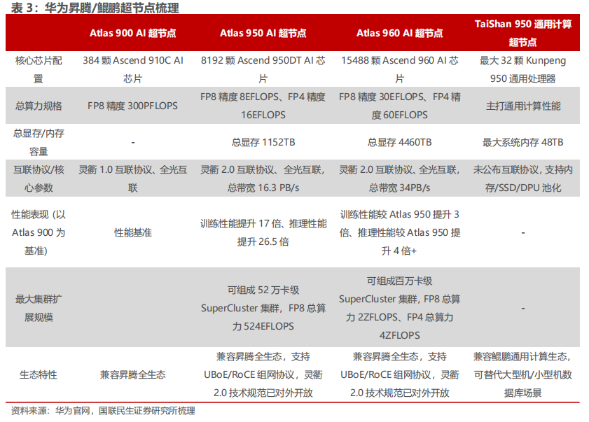 华为昇腾:从384超节点到万卡集群,国产算力龙头打造坚实计算底座。1)Atlas 900 AI超节点:搭载384颗Ascend 910C AI芯片,FP8精度总算力达300PFLOPS,采用自研灵衢1.0全光互联协议。2)Atlas 950 AI超节点:面向万亿参数大模型训练推理场景打造的万卡级旗舰超节点,搭载8192颗Ascend 950DT AI芯片,FP8精度总算力达8EFLOPS、FP4精度达16EFLOPS。3)Atlas 960 AI超节点:面向AGI场景打造的超大规模旗舰超节点,搭载15488颗Ascend 960 AI芯片,FP8精度总算力达30EFLOPS、FP4精度达60EFLOPS,可组成最大百万卡级的SuperCluster集群。4)TaiShan 950通用计算超节点:面向金融、政务等通用计算场景推出的超节点产品,最大支持32颗Kunpeng 950通用处理器,系统内存最大48TB,支持内存/SSD/DPU池化。