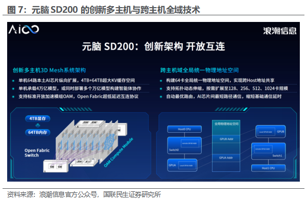 浪潮信息:元脑SD200超节点是当前国内大模型推理性能最强的本土AI超节点产品之一。1)元脑SD200超节点搭载64张本土AI芯片运行DeepSeek R1 671B大模型时,在输入长度4096、输出长度1024的场景下,单用户token生成速度达112 tokens/s,单token生成时延低至8.9ms,是国内首个突破10ms大关的本土超节点产品,大模型推理端到端体验领先行业。2)自研多主机低延迟内存语义通信架构,采用3D Mesh高性能互连超扩展系统,支持64张本土AI芯片高密度扩展,整机最大显存4TB、系统内存64TB。创新三层精简互连协议,报文有效数据利用率超96%,物理层误码率低至1012;首创交换域全局统一显存编址并研发影子设备技术,实现跨主机GPU P2P直接访问。