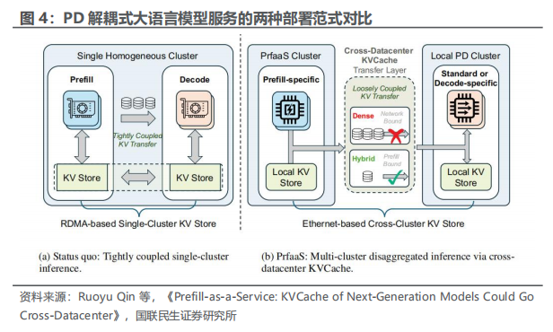 技术进步有望成为推动国产算力发展的又一重要动力。2026年4月,月之暗面(Moonshot AI)与清华大学联合发表了一篇论文,提出了一种名为 PrfaaS(预填充即服务)的新架构,成功打破了物理机房的限制,让大模型的推理算力可以跨越城市、跨越普通网络进行灵活调度。PrfaaS并非简单依赖缩减后的KVCache,而是将模型端的KV效率与系统端的选择性卸载、带宽感知调度及缓存感知请求分配相结合。这一设计消除了异构加速器必须共享相同低延迟 RDMA 架构的要求,使得预填充与解码能力可在松散耦合的集群间独立扩展。在一项针对内部1T参数混合模型的案例研究中,采用PrfaaS增强的异构部署方案,其服务吞吐量分别比同构PD方案和基础异构方案高出54%和32%,同时仅消耗了适度的跨数据中心带宽资源。随着模型架构的不断优化,大模型的推理算力将更多脱离物理限制,跨数据中心协作让国产算力有更多参与重要模型推理的机会,进而有望在长期内推动国产算力的发展。