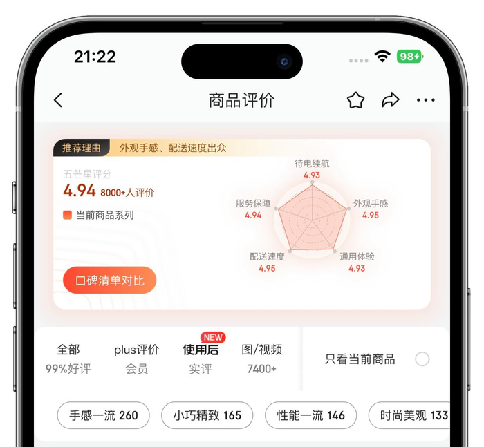 此外,目前在京东小米自营店中,#小米14#系列也收获了许多评价,其中小米14标准版显示已有1万+评价,小米14 Pro显示已有5000+评价,两款机型的好评率都是99%,用户给出的好评集中体现在手感优秀、小巧精致、性能出色、时尚美观等方面,五芒星评分高达4.94,一定程度上也说明了小米14有着出色的使用体验。