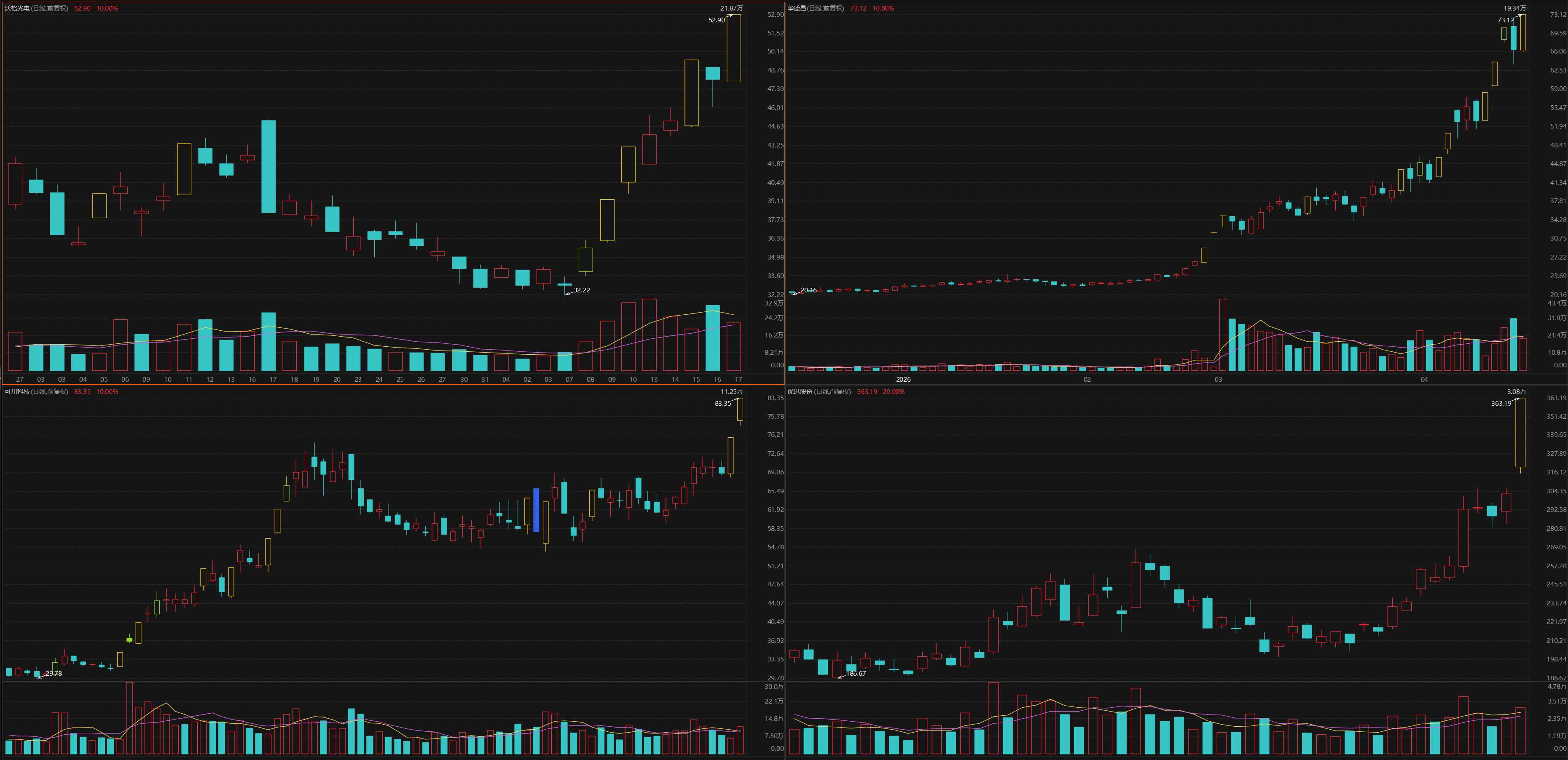 CPO概念股表现强势,截至周五收盘,玻璃基1.6T光模块/CPO产品已完成小批量送样的沃格光电7天4板,拟并购伽蓝特布局光通信模块和光芯片测试领域的华盛昌5天3板,子公司首条400G/800G高速光模块生产线已投产的可川科技2连板,专注于光通信前端收发电芯片的优迅股份20CM涨停。公司TCB设备研发进展顺利的快克智能、电子陶瓷外壳国家级制造业单项冠军中瓷电子、主营工业自动化设备及精密零部件制造的科瑞技术、全球率先开发800G/1.6T光模块厂商之一的剑桥科技、国内精密箱体行业领先企业世嘉科技、光器件全球市占率居前的光迅科技涨停。