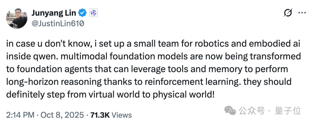 事实上,早在去年10月,通义千问团队内部就被曝组建了一个具身智能小分队。