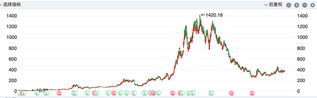 先看隆基的历史K线走势,可以看到2018年到2021年有过一波轰轰烈烈的超级大牛市行情,3年时间里最多上涨了10几倍,如果从2017年的低位算起,更是最高20倍的超级大牛,然后从2021年底后,用几年的时间最多跌去了80%,几乎是从哪里来回哪里去。