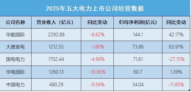 来源:2025年五大电力上市公司经营数据