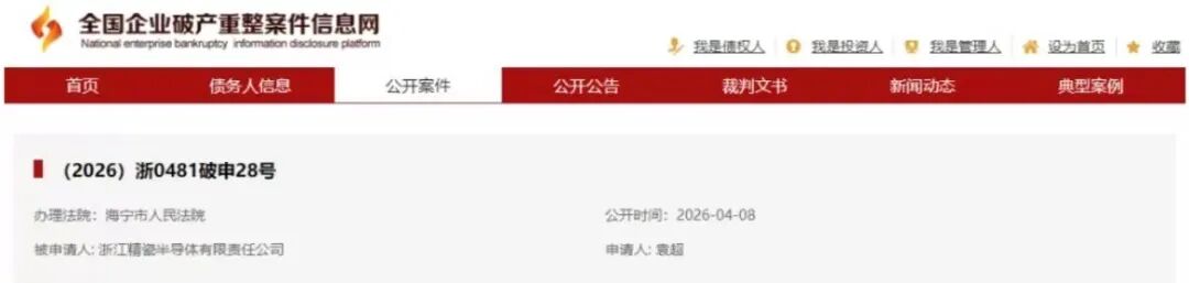2026年4月14日,海宁市人民法院一纸公告,宣告浙江精瓷半导体有限责任公司正式进入破产审查程序。