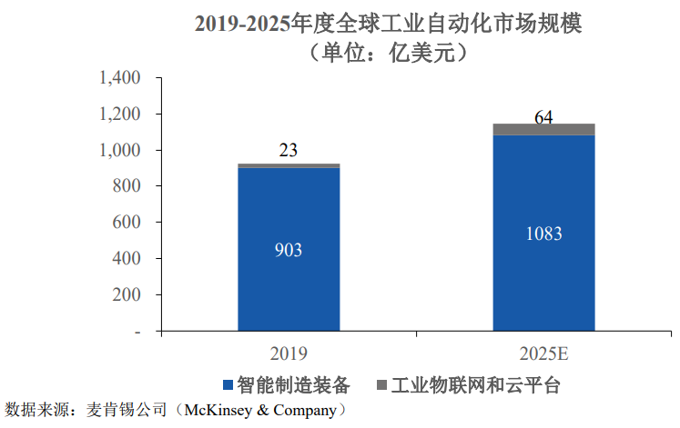 根据麦肯锡公司(McKinsey&Company)的数据,2019年全球工业自动化市场规模为926亿美元,2025年预计达到1,147亿美元,其中,智能制造装备的市场规模预计由903亿美元增长至1,083亿美元,复合增长率为3.08%。