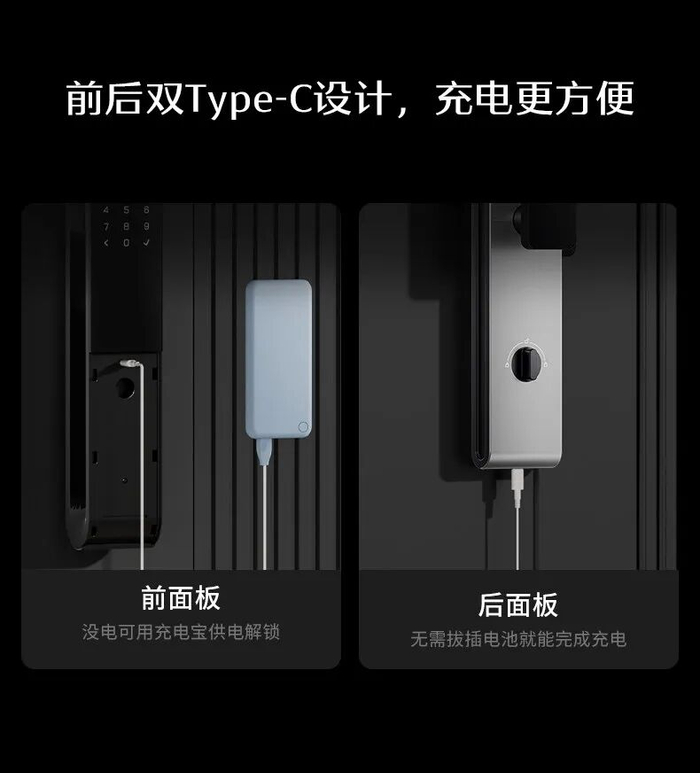 应急供电的新变化:几乎所有新品均在门外保留Type-C接口,支持充电宝临时供电开锁。部分产品(如德施曼U3F)甚至前后双C口,后屏可直接充电而无需拔电池。华为X1特设了应急“小红键”以启用储备供电解锁。