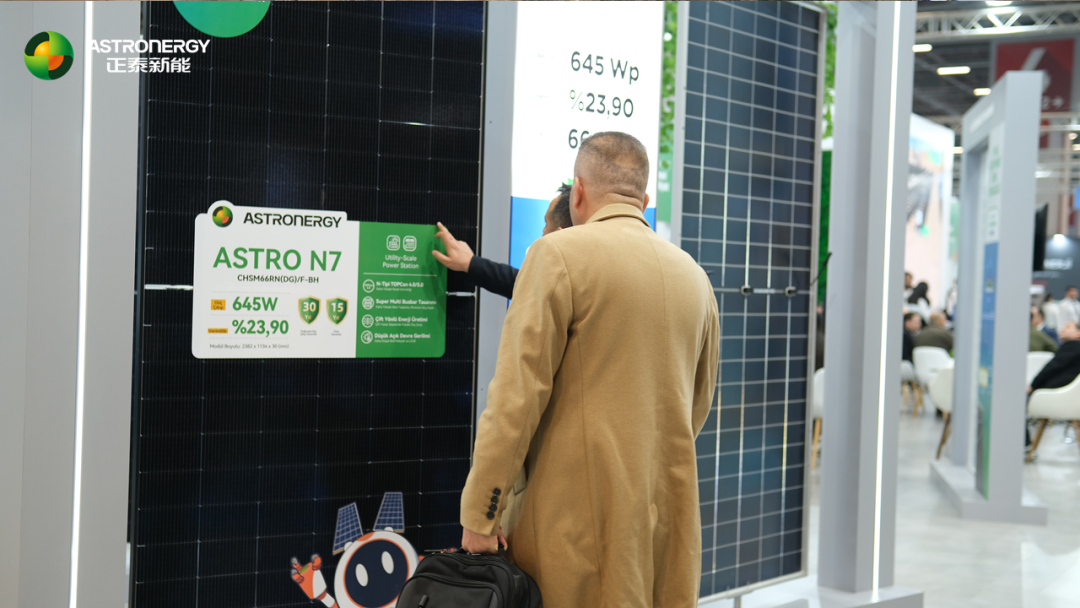 作为量产主力的ASTRO N7组件,则以高功率、高效率、高可靠性、高单瓦发电量以及高性价比等多重优势,受到参观者驻足。其独特的温度系数能有效应对土耳其极端高温环境,实现更高的单瓦发电量,为当地企业提供更具性价比的清洁能源解决方案。