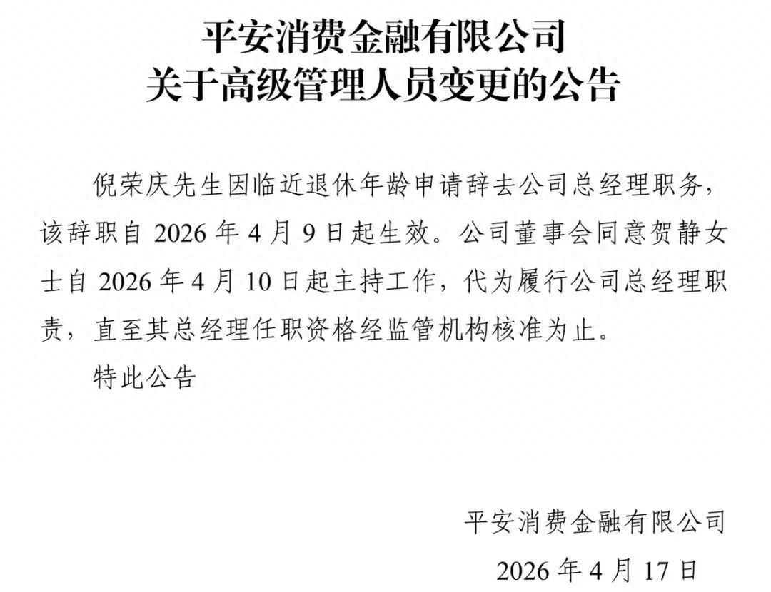 2026 年 4 月 17 日,平安消费金融有限公司发布高级管理人员变更公告,官宣公司迎来重大人事调整。