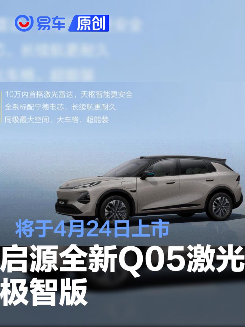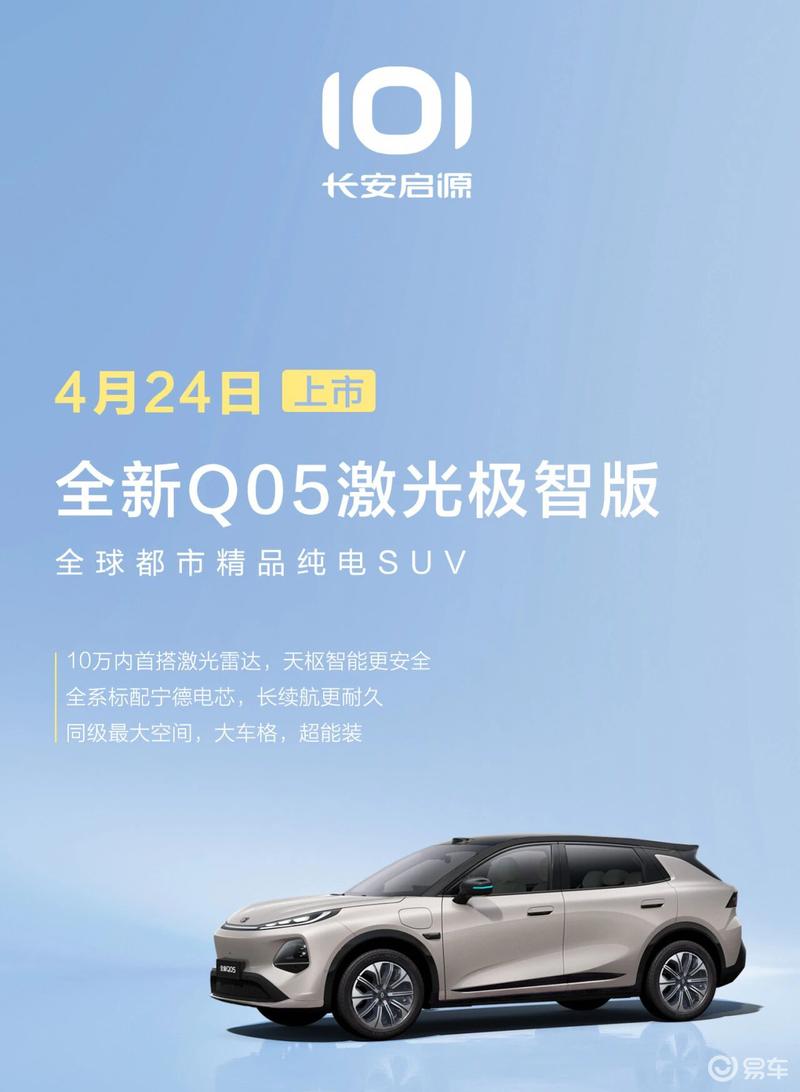 易车讯 4月20日,长安汽车发布“智启焕新季”新品预告,长安启源全新Q05激光极智版将在4月24日正式上市,新车定位全球都市精品纯电SUV。