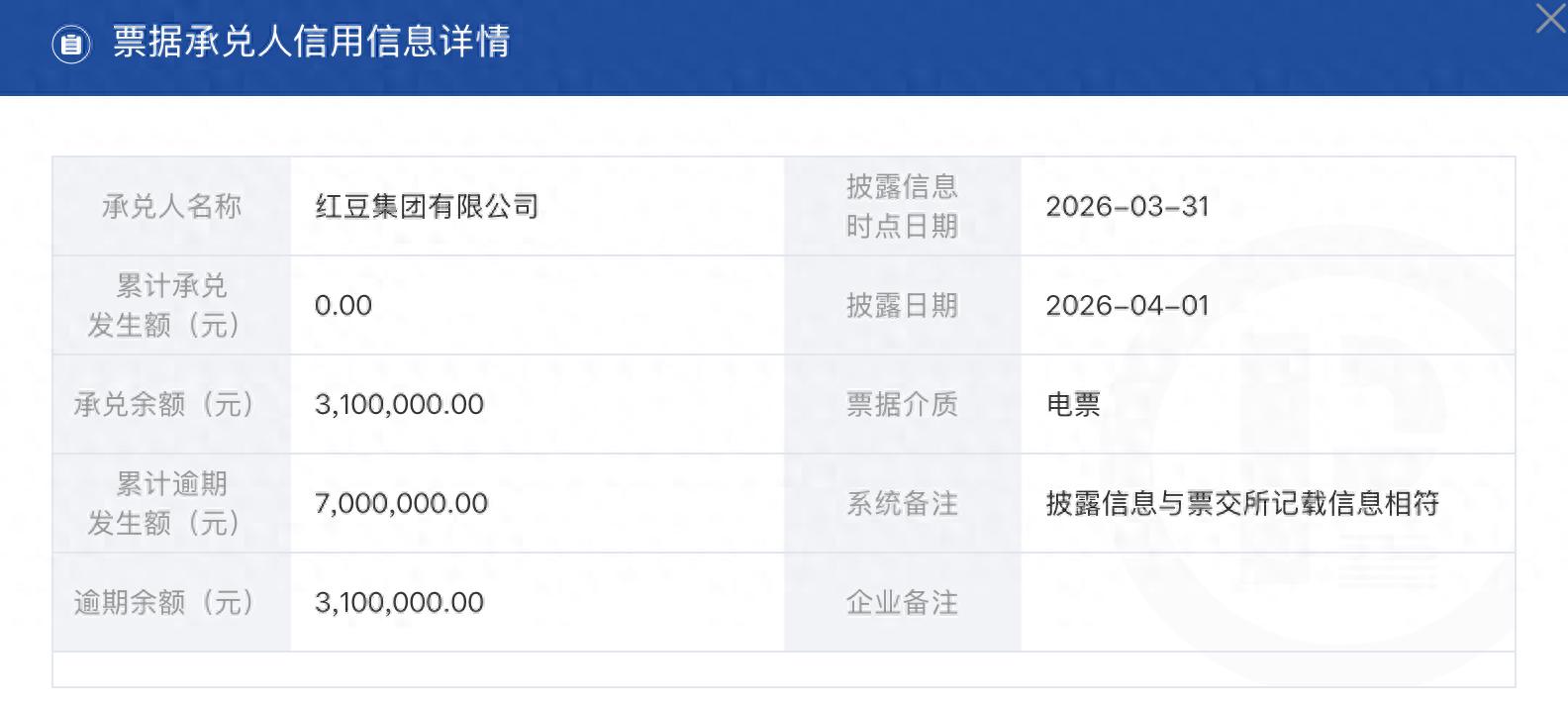 上海票据交易所4月1日披露,红豆集团票据累计逾期发生额达700万元。