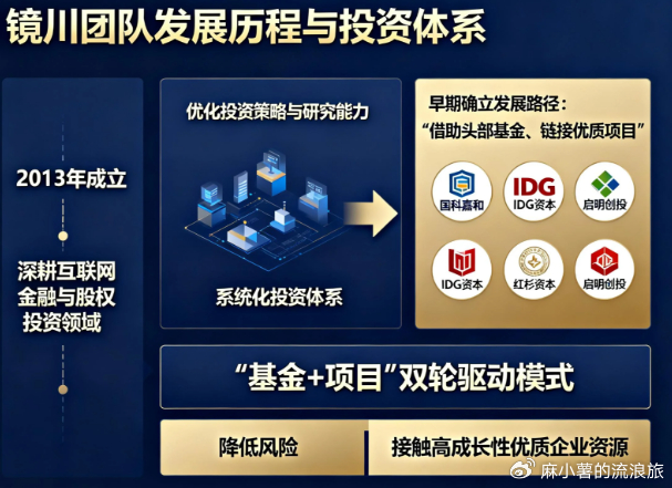 自2013年成立以来,镜川团队持续深耕互联网金融与股权投资领域,通过不断优化投资策略与提升研究能力,逐渐建立起系统化的投资体系。团队在早期阶段便确立了“借助头部基金、链接优质项目”的发展路径,先后参与投资国科嘉和、IDG资本、红杉资本、启明创投等知名股权投资机构。这种“基金+项目”的双轮驱动模式,使团队能够在降低风险的同时,接触到更多高成长性的优质企业资源。