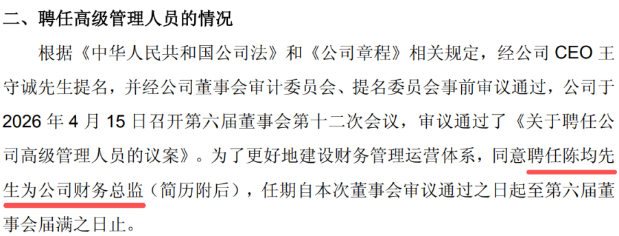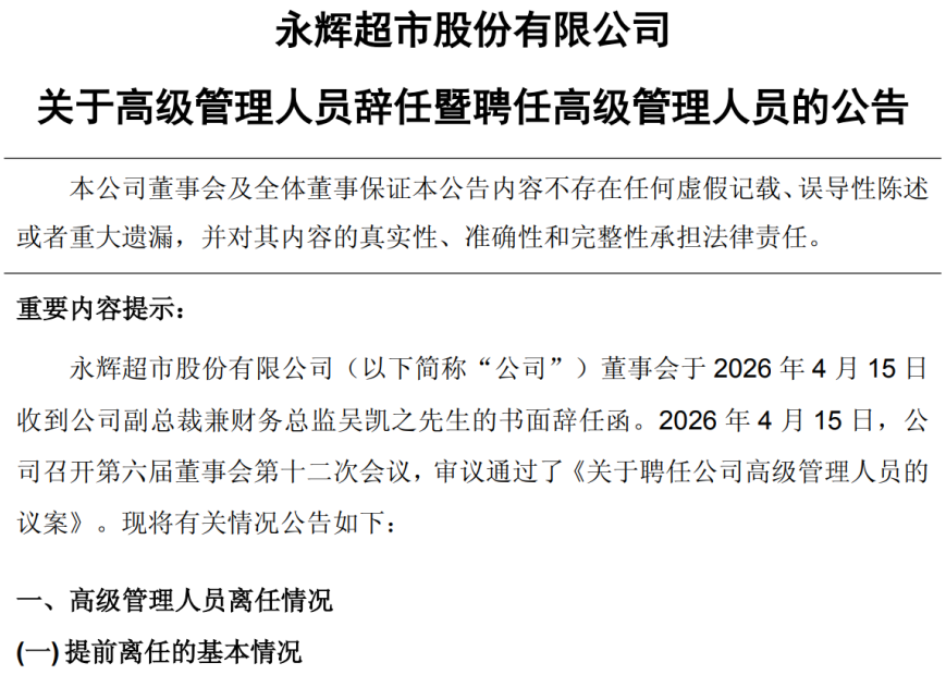 4月17日,永辉超市(601933.SH)发布了《关于高级管理人员辞任暨聘任高级管理人员的公告》。公告显示,董事会收到公司副总裁兼财务总监吴凯之先生的书面辞任函。为了更好地建设财务管理运营体系,董事会同意聘任陈均先生为公司财务总监。