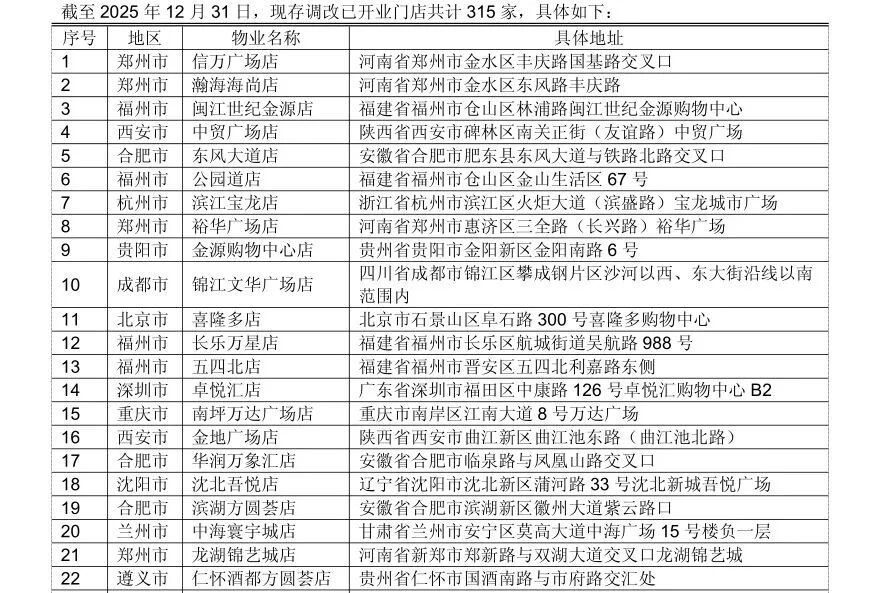 西藏在2025年末有2家门店,调改开业门店2家,包括拉萨柳梧万达店等,调改率为100%。