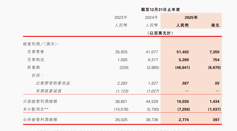 从业务对经营利润贡献看,京东物流、京东零售保持较为稳定的增长:京东零售经营利润从2023年的359.25亿元增长至2024年的410.77亿元,并在2025年进一步提升至514.02亿元;京东物流经营利润从2023年的10.05亿元大幅增长至2024年的63.17亿元,2025年继续保持增长,达到52.69亿元。