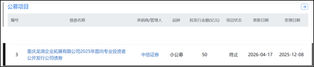 4月17日,上交所债券项目信息平台显示,重庆龙湖企业拓展有限公司2025年面向专业投资者公开发行公司债券项目状态更新为"终止"。该债券于2025年12月8日受理,拟发行金额50亿元,募集资金全部用于偿还公司债券本金,承销商及管理人为中信证券。