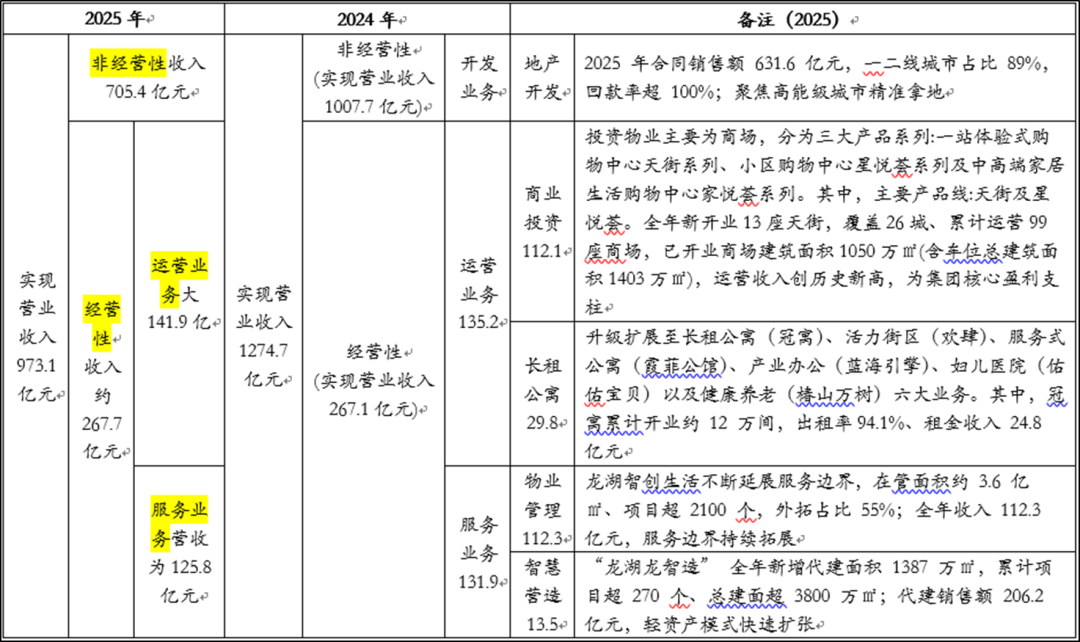 根据业绩,按照龙湖的业务分类口径,分为“五大航道”——地产开发、商业投资、资产管理、物业服务、龙智造(智慧营造)。整个2025年经营压力还在增加,除了天街商场(商业投资)小幅增长外,其他都在下滑,下滑最厉害的是地产开发、下降为705.4亿元,占总营收的比例仍达到72.49%。支撑龙湖存活下来,全靠天街这些商场,按照公司自己的说法是几乎“开一座火一座”,新开商场期末平均出租率超过96%。