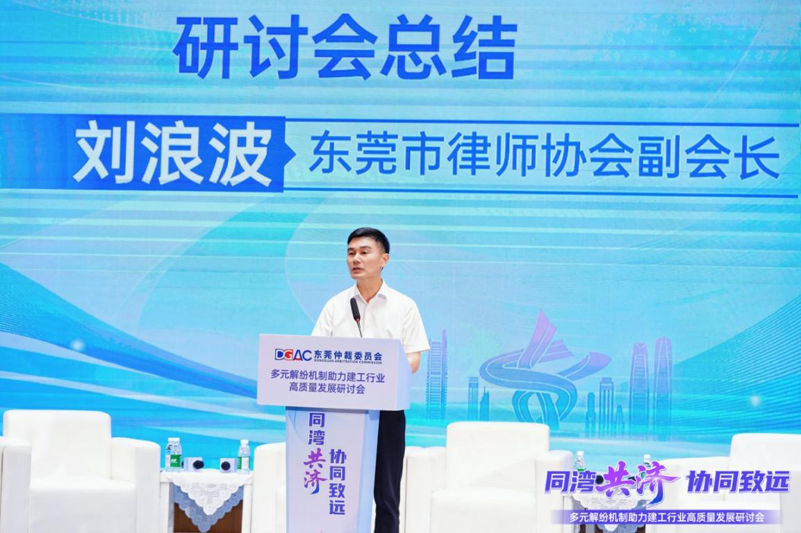 东莞市律师协会副会长刘浪波作总结发言时表示,本次研讨会主题鲜明、务实高效,充分展现了仲裁、调解、争议评审等非诉机制在建工领域的独特价值和广阔应用前景。