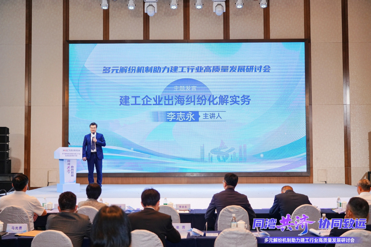 在主题分享环节,多位业界专家贡献了前沿观点。中建国际建设有限公司总法律顾问、首席合规官李志永作“建工企业出海纠纷化解实务”主题发言,结合企业境外项目实战经验,系统梳理了建工企业出海常见的法律风险点及仲裁应对策略。