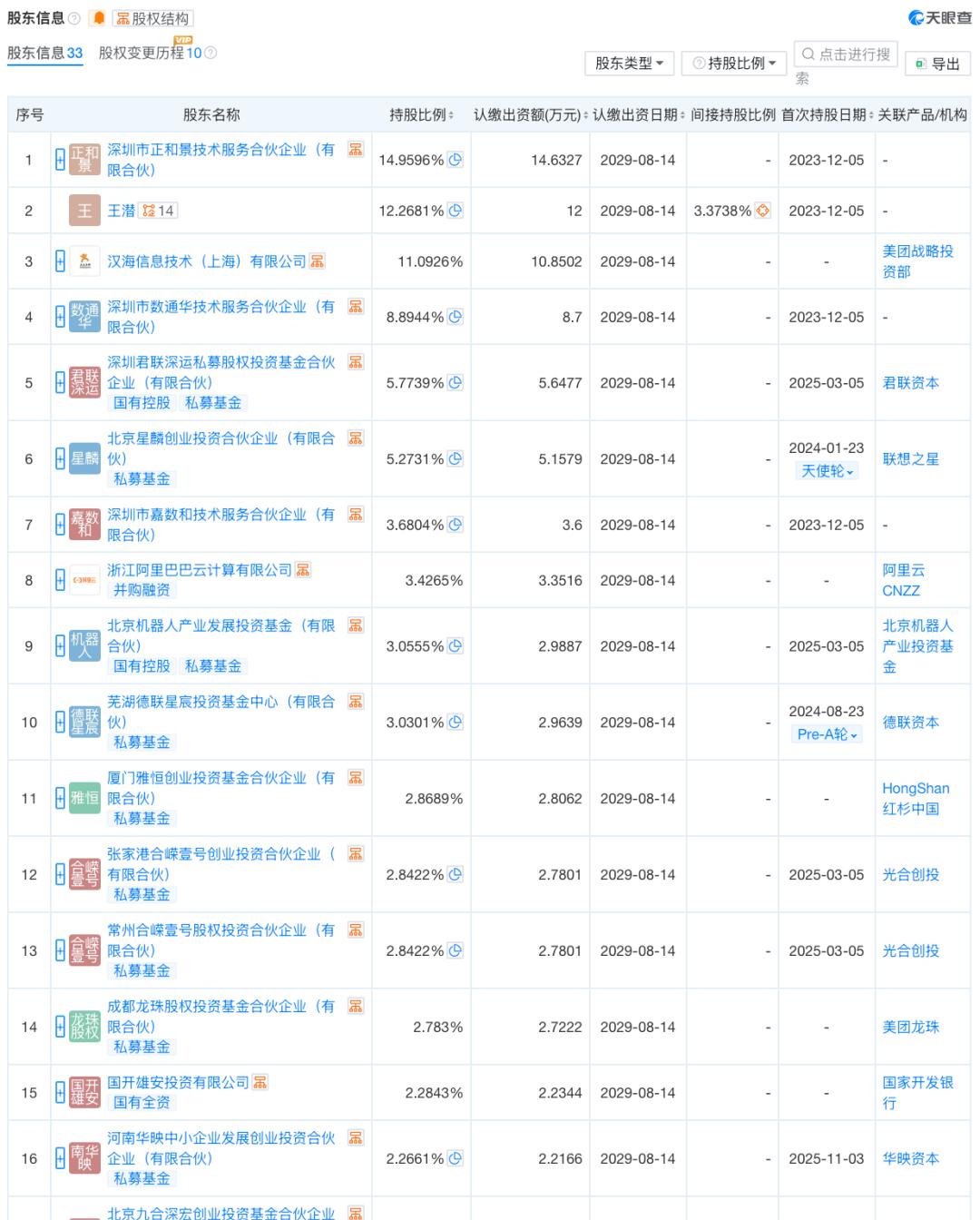 此外,美团战略投资部通过汉海信息技术(上海)有限公司持有自变量11.0926%股份,系第一大外部股东,同时,美团龙珠通过成都龙珠股权投资基金合伙企业(有限合伙)持股2.783%;阿里云CNZZ通过浙江阿里巴巴云计算有限公司持股3.4265%;字节、小米方面的具体持股情况,则暂未体现在自变量股权信息中。
