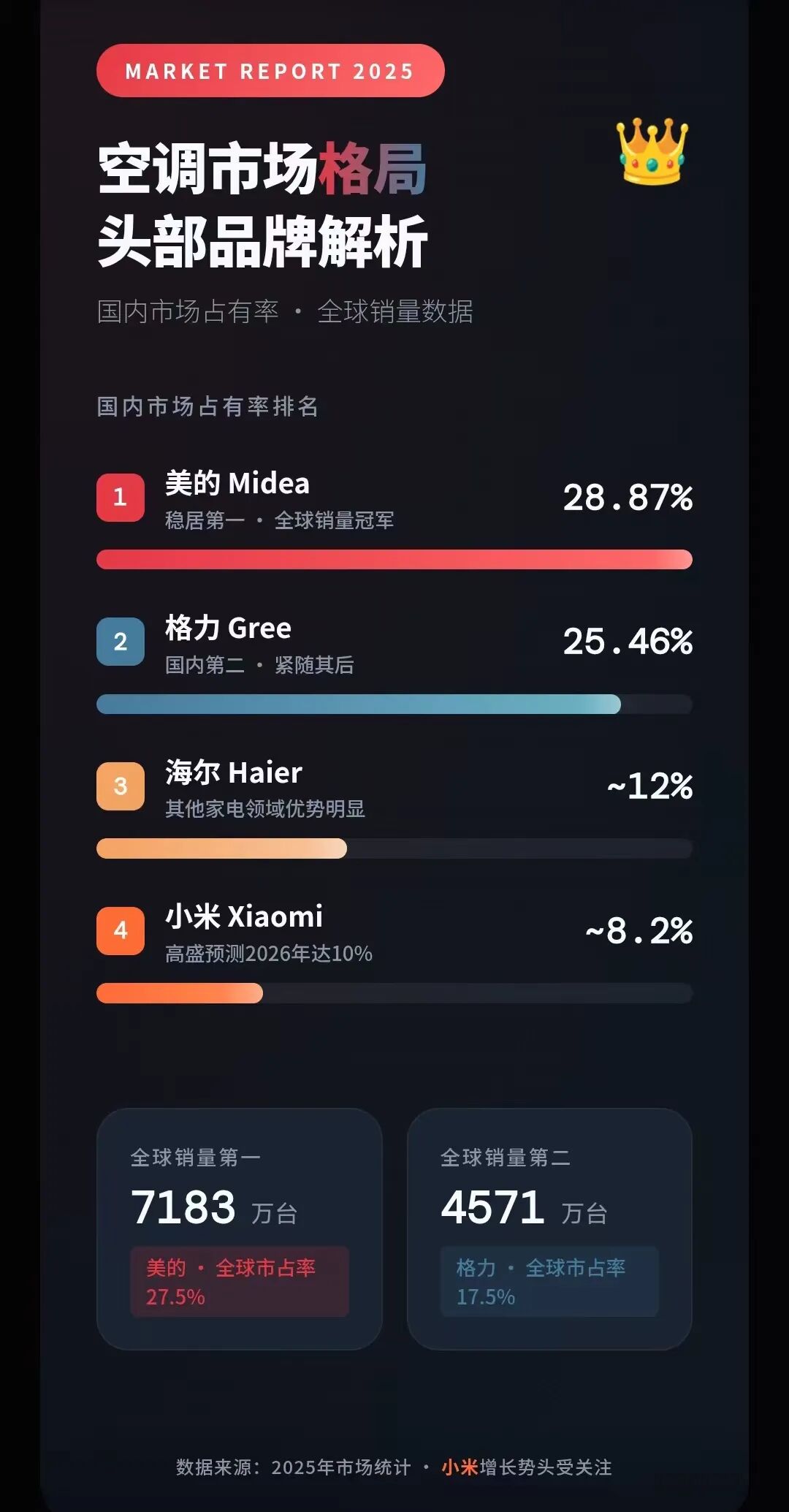目前,在国内市场,美的、格力、海尔坐稳空调市场占有率前三的位置,但小米2025年增长势头二分迅猛,在武汉无人空调智能工厂的加持下,2026年有望向前三发起冲击。