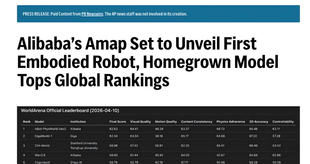 从今年2月发布具身导航基座模型ABot-N0,到3月31日全量开源具身操作基座模型ABot-M0,在Libero-Plus基准上任务成功率达80.5%,较此前标杆方案Pi0提升近30%。短短三个月内,高德Abot-world系列模型已在15项国际权威评测中拿下第一,测试成绩超过了谷歌与英伟达等企业及研究机构。高德此时推出四足机器人,或将成为阿里将“空间智能”转化为物理应用的关键一跳。
