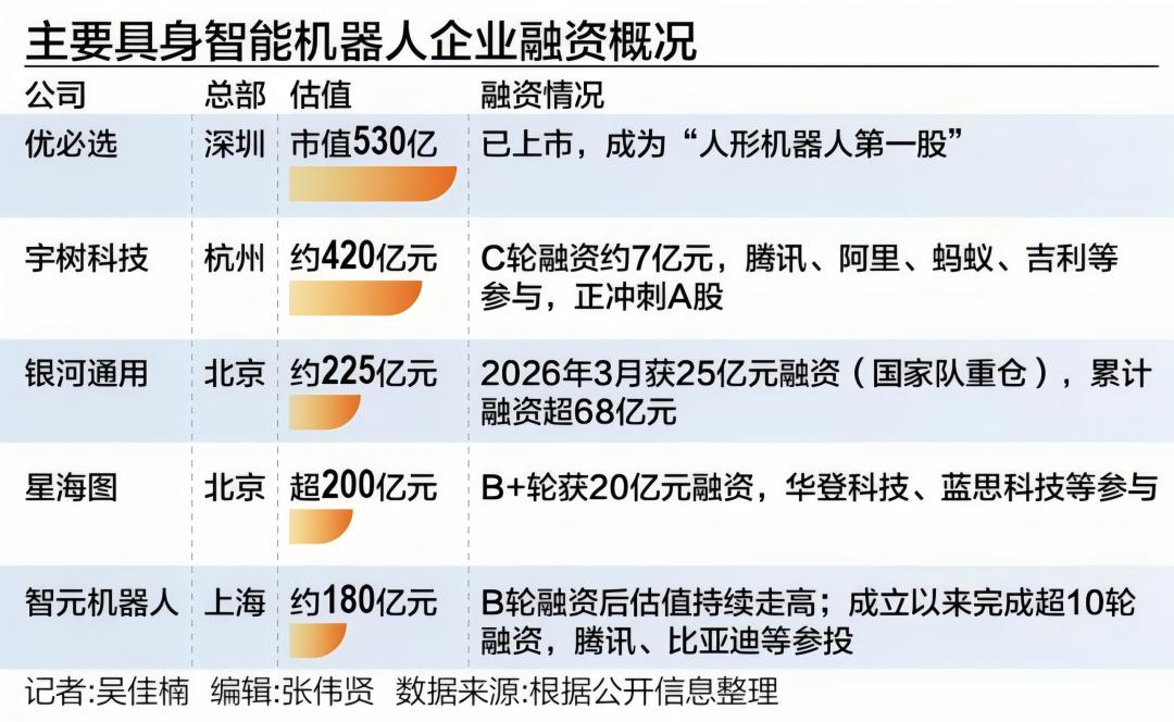 2026年,资本的热钱仍在加速向头部集中,截至目前,国内估值达百亿元的具身智能企业已有13家,宇树科技、银河通用、智元机器人、星海图等名字频繁出现在同一张榜单上。其中,宇树科技在IPO发行阶段的估值已达到约420亿元,银河通用则在今年3月完成25亿元融资、估值约210亿元。