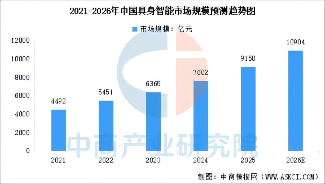 中商产业研究院的数据同样指向了相似的趋势,2025年中国具身智能市场规模约9150亿元,同比增长20.4%。其分析师预测,2026年中国具身智能市场规模将达到10904亿元,具身智能机器人解决方案市场规模则将达到449亿元。