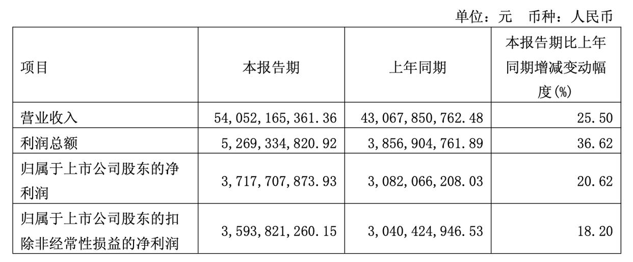 2026年第一季度,公司实现营业收入540.52亿元,较上年同期增长25.50%;归属于上市公司股东的净利润达37.18亿元,同比增幅为20.62%。