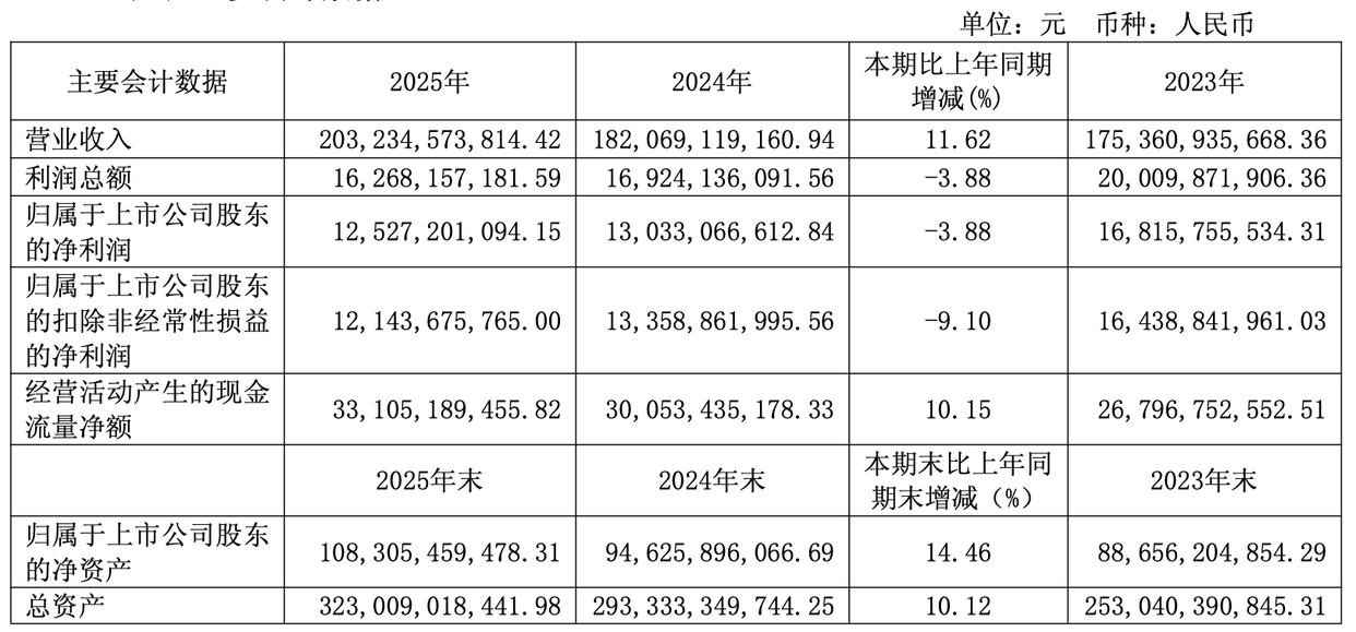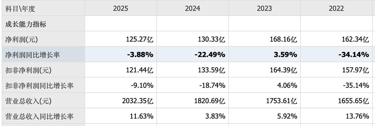 2025年公司实现销售收入2032.35亿元,同比增加11.62%;实现归属于上市公司股东的净利润125.27亿元,同比下降3.88%;每股收益3.99元。