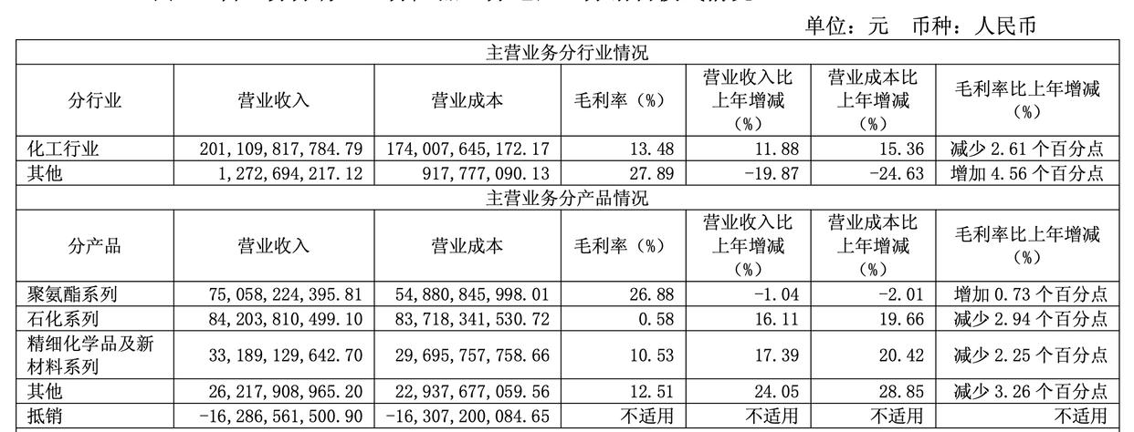 作为万华化学核心业务板块之一,其石化业务实现营业收入842.04亿元,同比增长16.11%,但营业成本增速达19.66%,导致毛利率仅剩0.58%,较上年同期下降2.94个百分点。
