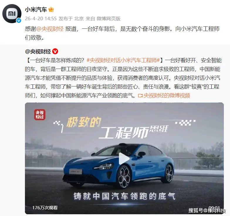央视财经表示:一台好看好开、安全智能的车,背后是一群工程师的日夜坚守。正是因为这些不断追求极致的工程师,中国新能源汽车才能凭借不断提升的品质与体验,获得消费者的高度认可。小米汽车回应:感谢央视财经报道,一台好车背后,是无数个奋斗的身影。向小米汽车工程师们致敬。