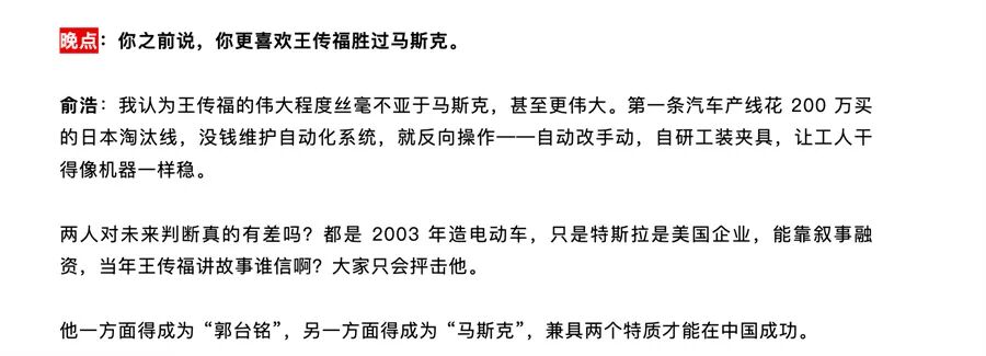 但这样一个“狂人”却也有真心赞许的“老登”。日前,《晚点》有关俞浩的一篇专访中,出现了一个俞浩对于比亚迪董事长王传福的观点——“我认为王传福的伟大程度丝毫不亚于马斯克,甚至更伟大”。