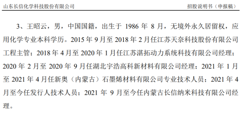据公开信息,王昭云曾在山东长信化学递交的招股书中被列为“其他三名核心技术人员”之一,履历显示其于2015-2018年期间曾在天奈科技任职,后分别担任内蒙古长信纳米科技有限公司经理及山东长信化学股东。