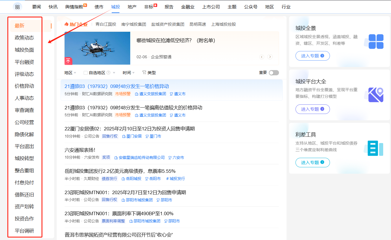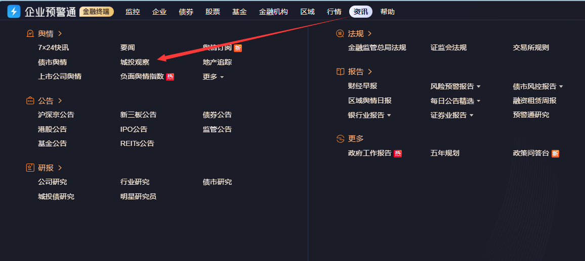 登录企业预警通网页端(http://www.qyyjt.cn)—资讯专题—【舆情】项下【城投观察】即可分类详细查看!