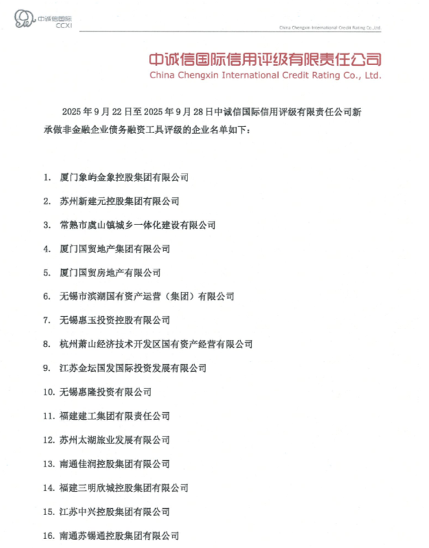 中诚信国际新承做非金融企业债务融资工具评级的企业名单(2025.9.22-2025.9.28)